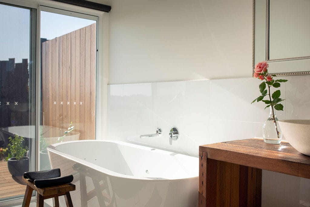 There are a few unique features of this property that have helped make it into a rustic coastal cottage. These include the recycled hardwood entrance door, the hardwood bathroom barn door and the stringybark flooring which meets with the stringybark decking outside.